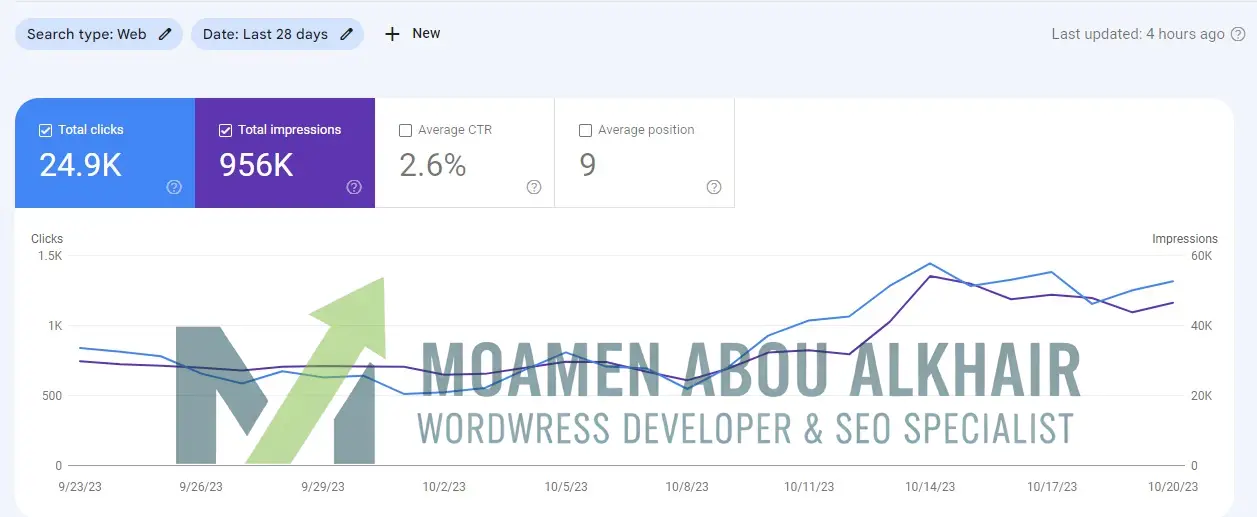 الوصف: يوضح الرسم البياني هنا قفزة قوية في النصف الثاني من الشهر، حيث ارتفعت النقرات اليومية من مستويات 500 نقرة إلى ما يزيد عن 1000 نقرة يومياً. هذا التحسن الملحوظ في الـ CTR والوصول للمركز 9 كمتوسط، يعكس نجاح تحسين تجربة المستخدم وتوافق الموقع مع تحديثات خوارزميات جوجل الأخيرة.