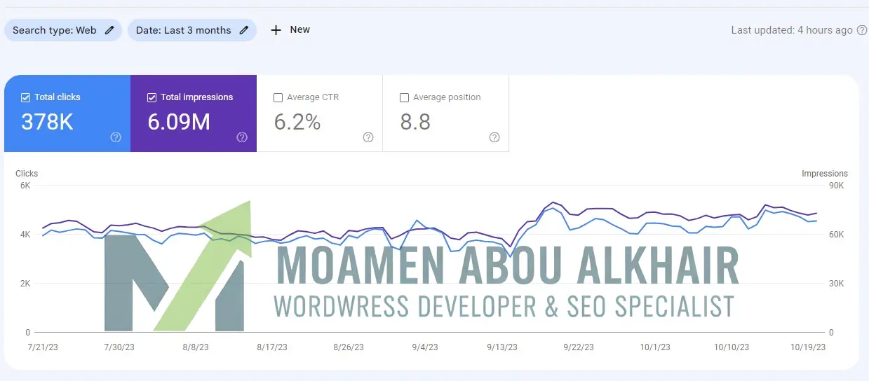 الوصف والنتيجة: توضح هذه الصورة القدرة على إدارة مشاريع ضخمة الحجم، حيث تم الوصول إلى أكثر من 100 مليون ظهور. النجاح هنا يكمن في الحفاظ على نسبة نقر (CTR) مرتفعة (4.2%) رغم ضخامة عدد مرات الظهور، مما يعني أن المحتوى يظهر للجمهور المستهدف بدقة. النتيجة هي تحقيق تدفق مستمر من الزوار بلغ قرابة 5 ملايين زائر، مع الحفاظ على متوسط ترتيب في الصفحة الأولى (8.4)، وهو إنجاز تقني يعكس قوة الأرشفة وتوافق الموقع مع معايير جوجل.