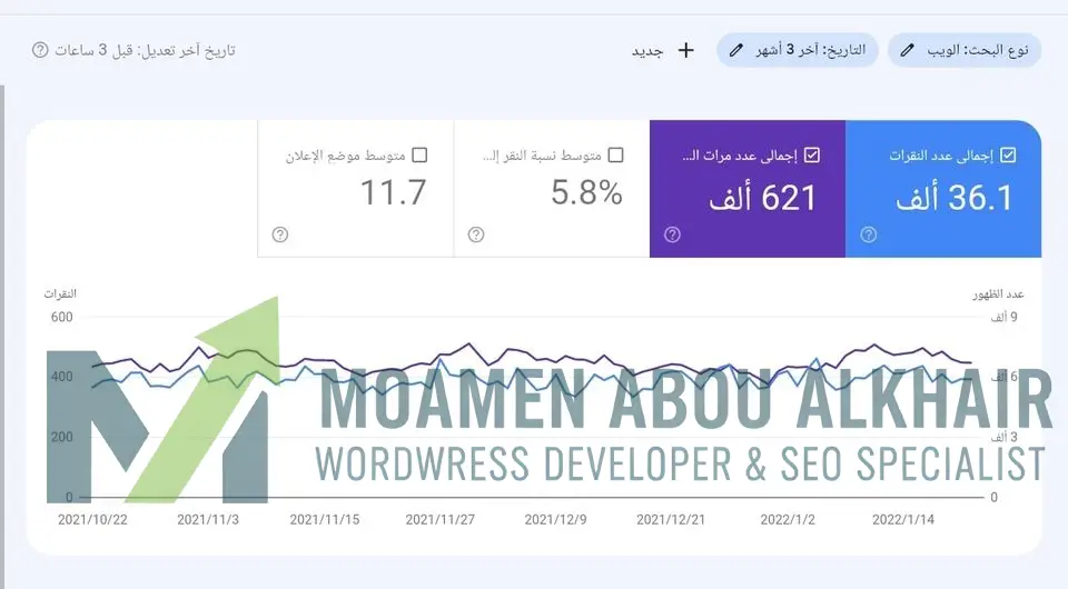 الوصف: يركز هذا التقرير على فترة 3 أشهر من العمل المستمر على تحسين المحتوى الداخلي، حيث نلاحظ ارتفاع نسبة النقر (CTR) إلى 5.8%، وهي نسبة ممتازة تدل على جاذبية العناوين والأوصاف (Meta Descriptions) للمستخدمين. تم الحفاظ على وتيرة ظهور مستقرة رغم التحديثات المستمرة، مما ساهم في بناء سلطة (Authority) قوية للموقع أمام خوارزميات جوجل.