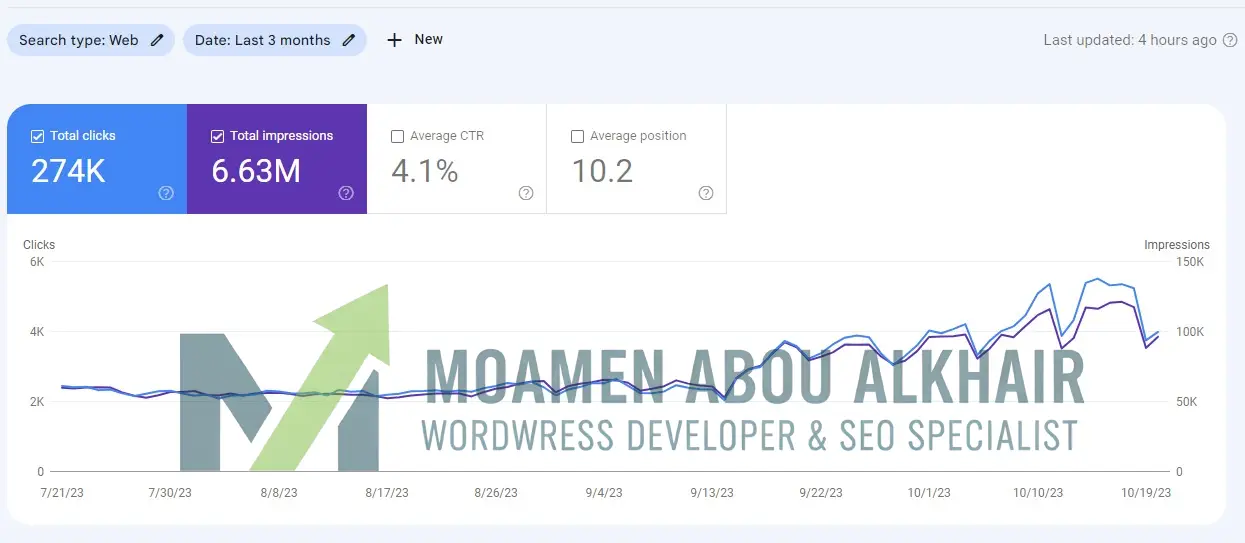الوصف: يعكس هذا الرسم البياني نمواً “صحياً” وتصاعدياً، حيث نرى زيادة مطردة في النقرات والظهور يوماً بعد يوم. لم تكن هناك طفرات عشوائية، بل تقدم ثابت ومدروس. تحقيق 274 ألف نقرة بمتوسط موضع قريب جداً من النتائج الخمس الأولى (10.2 هو المتوسط، والعديد من الكلمات في المركز 1-3) يعزز من قيمة الموقع السوقية.